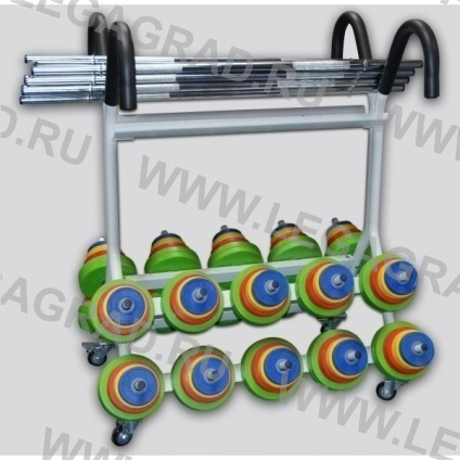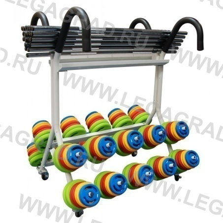 Подставка для хранения штанг для фитнеса и блинов - удобный и полезный аксессуар для фитнес центров. Подставка под аэробные штанги довольно вместительная, привлекательная по дизайну. Вы сможете разместить на ней примерно 20 комплектов. Прочная металлическая рама. Колесики позволяют легко передвинуть подставку даже со штангами.
