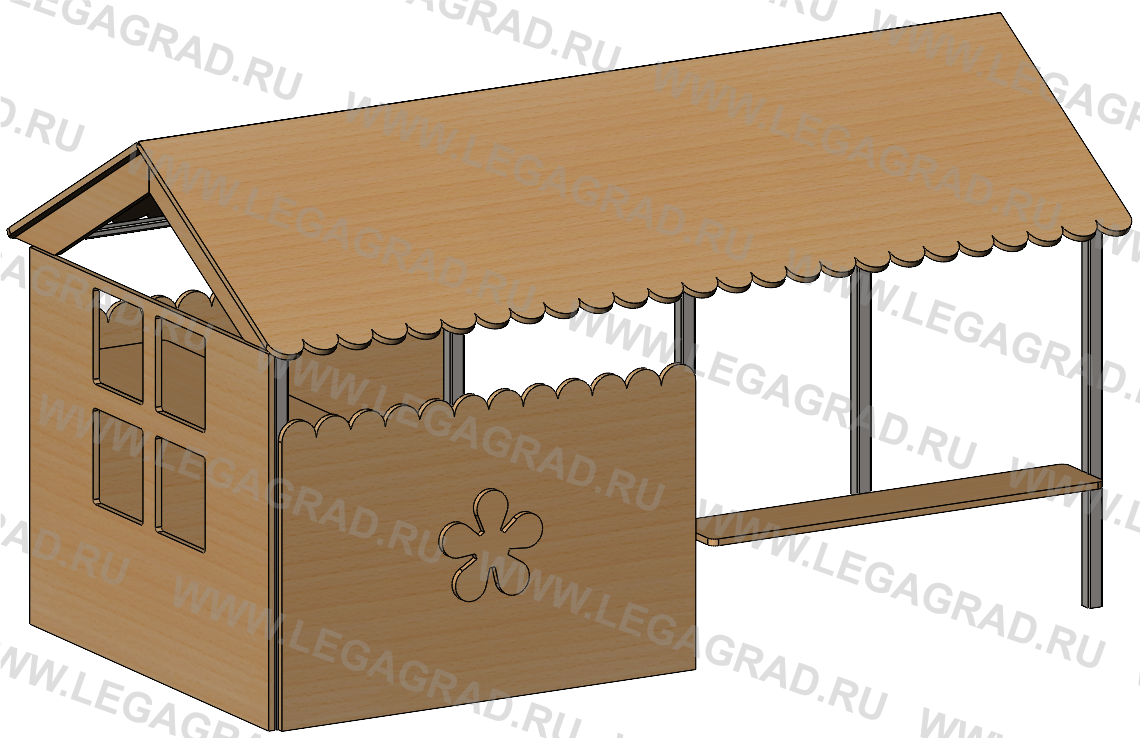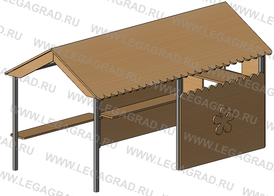 Домик предназначен для детей от 2-х до 7-ми лет. Несущие столбы домика выполнены из металлической трубы сечением 40х40, 40х20 мм. Столбы бетонируются в землю. Скаты двухскатной крыши, боковые стенки, скамья 2 шт, стол 1шт и декоративные накладки изготовлены из влагостойкой окрашенной фанеры толщиной 18 мм. Деревянные детали тщательно отшлифованы, загрунтованы и окрашены. Металлические детали окрашены порошковыми красками.