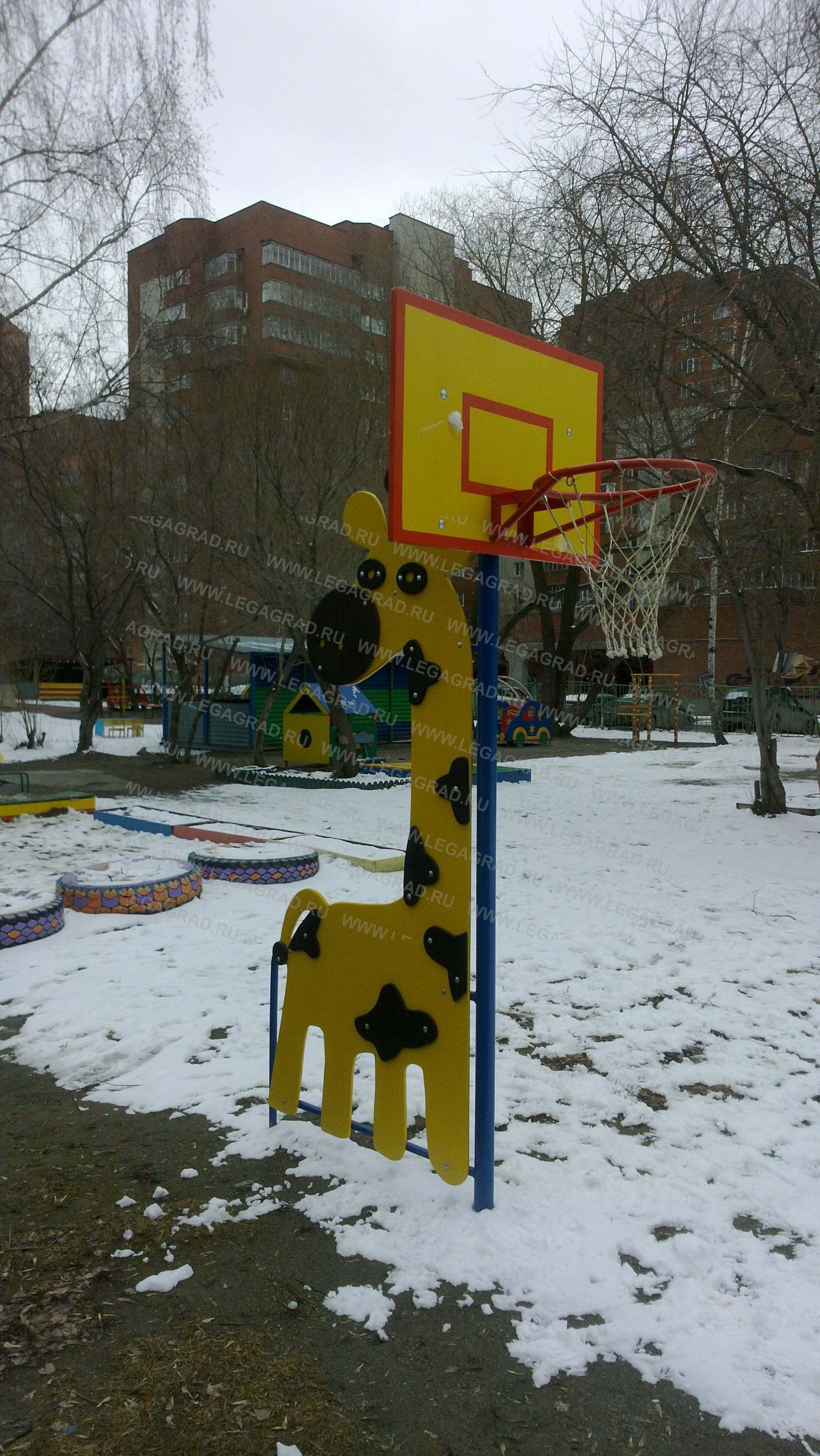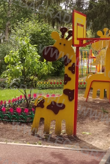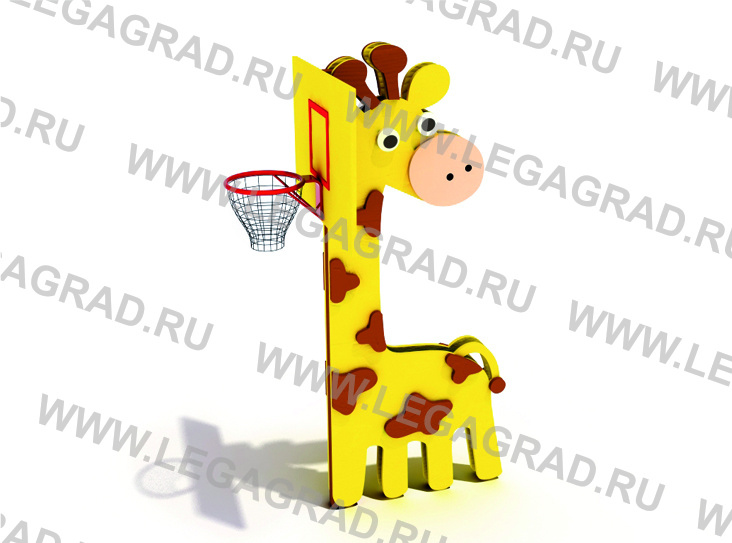 Стойка баскетбольная "Жираф" для детей от 5-ти до 7-ми лет. Состоит из щита баскетбольного 0,9х0,6м, элемента в виде "Жираф" выполненного из влагостойкой фанеры толщиной 18мм. Кольцо баскетбольное диаметром 0,38м выполненного из трубы металлической сечением 21мм, сетка баскетбольная -1шт.Высота до кольца баскетбольного 1,9м. Стойка выполнена из металлической трубы сечением 57мм. Фанерная деталь "Жирафа" крепится на металлический каркас из трубы сечением 21мм. Стойки бетонируются. Деревянные детали тщательно отшлифованы, загрунтованы и окрашены. Металлические детали окрашены порошковыми красками.