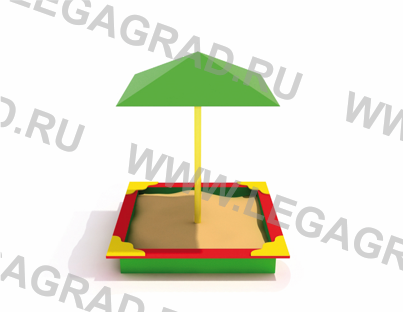 Песочница предназначена для детей от 1-го года. Над песочницей крыша 4-х скатная из листа металлического 0,7мм, каркас металлический из трубы 40х20мм, стойка из трубы сечением 60мм. Песочница высотой 0,3м выполнена из доски камерной сушки толщиной 35 мм в количестве: 8 шт. (боковые), соединенных по углам металлическими уголками 0,4м. Наличник 4 шт. из доски 20мм. Углы песочницы закрыты декоративными элементами из влагостойкой фанеры толщиной 18мм. Деревянные детали тщательно отшлифованы, загрунтованы и окрашены. Металлические детали окрашены порошковыми красками.