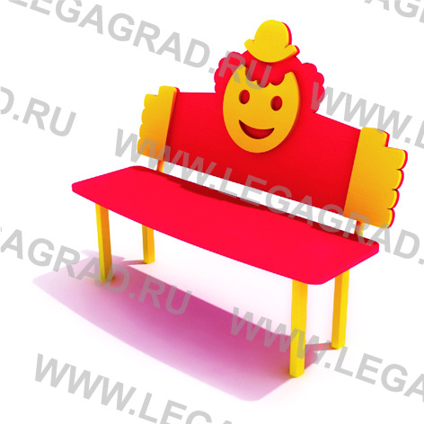 Скамейка предназначена для детей от 3-х до 9-ти лет. Изготовлена из влагостойкой окрашенной фанеры толщиной 18 мм на металлическом каркасе из трубы сечением 40х20мм. Фигурная спинка выполнена в виде клоуна. Фанерные детали тщательно отшлифованы, загрунтованы и окрашены профессиональными красками. Ножки бетонируется в землю. Возможно изготовление скамеек для монтажа к полу веранды.
