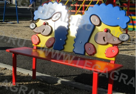 Скамейка предназначена для детей от 3-х до 9-ти лет. Изготовлена из влагостойкой окрашенной фанеры толщиной 18 мм на металлическом каркасе из трубы сечением 40х20мм. Фигурная спинка выполнена в виде ёжиков. Фанерные детали тщательно отшлифованы, загрунтованы и окрашены профессиональными красками. Ножки бетонируется в землю. Возможно изготовление скамеек для монтажа к полу веранды.