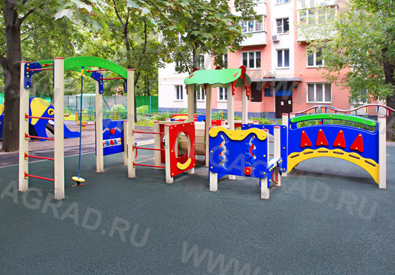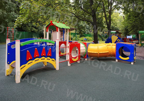 влагостойкая ламинированная ФСФ фанера; влагостойкая ФСФ фанера; покрытые порошковыми красками металлические элементы; оцинкованный крепеж; пластиковые заглушки на места резьбовых соединений; двухкомпонентная краска для деревянных элементов; пластиковые развивающие элементы (счеты); канат из полипропилена; пластиковая горка тоннельного типа.