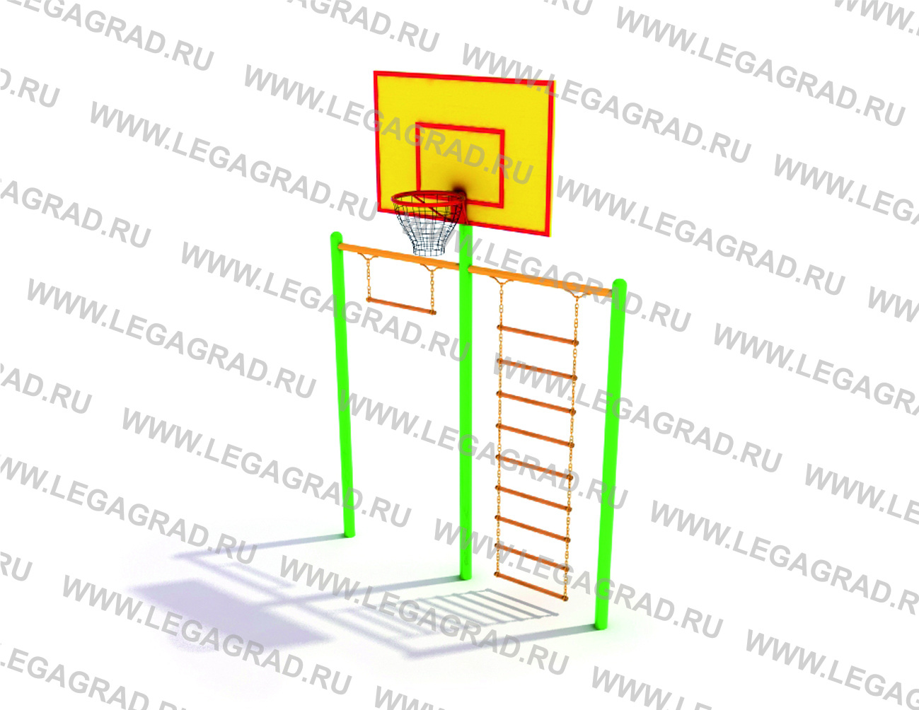 Спортивный комплекс. Выполнен из металлической трубы сечением Ø 57, 26, 21мм. Металлические элементы окрашены порошковыми красками. Щит баскетбольный фанера ФСФ 18 мм, кольцо б/б антивандальное.