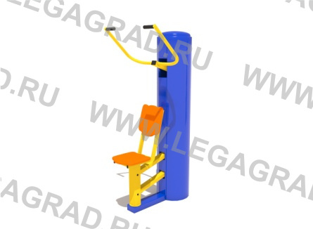 Тренажер "Верхняя тяга" Назначение: Способствует укреплению мышц плечевого пояса и рук. Несущие стойки тренажера выполнены из металлической трубы профильной 40х60мм, 40х40мм, 40х20мм сверху стойки и механизмы закрыты цилиндрической стойкой Ø 320 мм . Все шарнирные узлы имеют подшипники скольжения закрытого типа. Сидение и спинка изготовлены из ударопрочного и морозостойкого пластика. Все жесткие соединения выполнены при помощи электросварки. Металлические элементы окрашены порошковыми красками. Крепежные элементы и места срезов труб защищены пластиковыми заглушками. Расчетная нагрузка на устойчивость и прочность узлов 150 кгс.