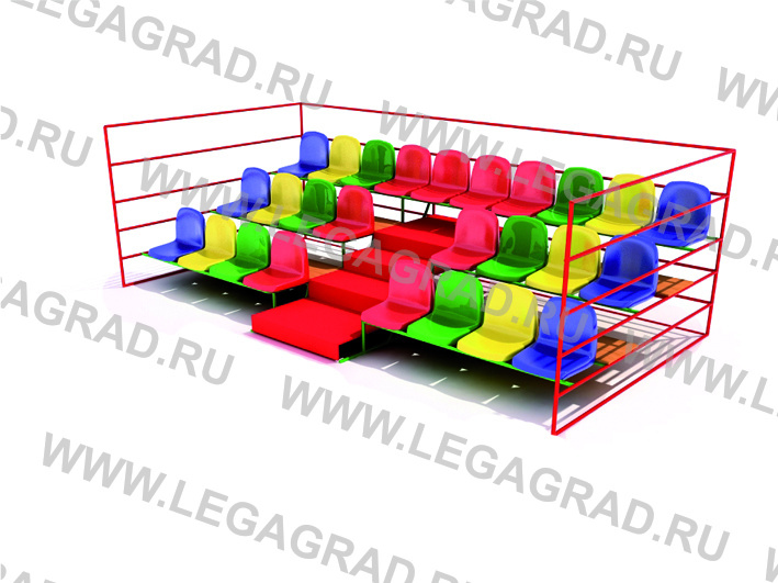 Трибуна, места для болельщиков. Каркас трибуны выполнен из металлической трубы профильной 40х40, 40х20, 20х20мм. Металлические элементы окрашены порошковыми красками. Пол в проходах выполнен из фанеры ЛФСФ с сеткой толщиной 15мм. Пластиковое сиденье со скруглённой спинкой, габариты 435х395х330мм. Сидение имеет отверстия для фиксации и систему оттока воды. Возможна комплектация трибун сидением без спинки. Цвета: желтый, красны, синий зеленый, белый, оранжевый. Температурный режим эксплуатации — до -30 градусов. Используется для установки на стадионах.