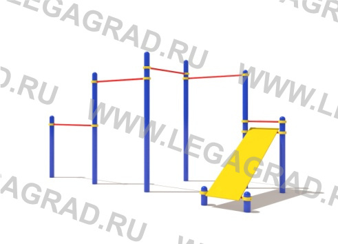 6-ти перекладин турник (стальная труба диаметром 34мм с толщиной стенки 3,2мм. Длинна перекладин 1200мм. На концах перекладины отверстия под болты М10), и секции лавка (Ширина секции 450 мм, высота 1000 мм., длина 1500 мм. Секция лавка цельная.). Перекладины расположены на высоте 2400мм, 2200мм, 2200мм, 1300мм, 1300мм, 1100мм. Крепеж перекладин к вертикальным опорным столбам осуществляется при помощи хомутов, которые состоят из двух полуколец соединяемых между собой с помощью 2-х винтов М10.\