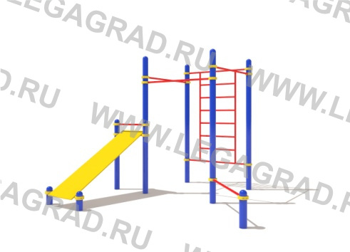 4-х перекладин турник (стальная труба диаметром 34мм с толщиной стенки 3,2мм. Длинна перекладин 1200мм. На концах перекладины отверстия под болты М10), 2-х перекладин лавка (Стальная труба диаметром 34мм с толщиной стенки 3,2мм. Длинна перекладин 510мм. На концах перекладины отверстия под болты М10), секции лавка (Ширина секции 450 мм, высота 1000 мм., длина 1500 мм. Секция лавка цельная.) и секции лестница (ширина секции 1200мм. Секция лестница цельная. В состав секции лестница входит семь горизонтальных перекладин, из трубы диаметром 34мм толщиной стенки 3,2мм, две вертикальные несущие перекладины из трубы диаметром 48мм с толщиной стенки 3,5мм. Шаг лестницы 310мм.). Перекладины расположены на высоте 2300мм, 2200мм, 2100мм, 300мм, 1100мм, 1300мм, 400мм, от поверхности основания. Крепеж бруса осуществляется полухомутами к горизонтальным перекладинам лавка. Крепеж перекладин к вертикальным опорным столбам осуществляется при помощи хомутов, которые состоят из двух полуколец соединяемых между собой с помощью 2-х винтов М10.