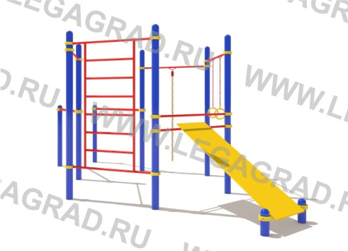 5-ти перекладин турник, секции лавка, секции лестница, 2-х перекладин брусья. Крепеж перекладин к вертикальным опорным столбам осуществляется при помощи хомутов.