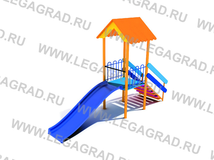 Детский игровой комплекс с предназначен для детей от5-ти до 8-ми лет . Комплектация: горка Н=1,25 м -1 шт, площадка - 1 шт, крыша - 1 шт, лестница - 1шт. Несущие столбы комплекса выполнены из металлической трубы сечением 48 мм. Столбы бетонируются в землю. Пол на площадке изготовлен из влагостойкой ламинированной нескользящей фанеры толщиной 15 мм и металлического каркаса из трубы сечением 40х20мм. Горка стеклопластиковая H=1,25 м. Горка имеет стартовую площадку с перекладиной сечением Ø 26 мм, заставляющую ребенка присесть, полосу разгона и участок торможения. Комплекс включает в себя одну башню со стеклопластиковой крышей, металлический каркас лестницы изготовлен из трубы сечением 40х20мм, уголка 40 и имеет металлические поручни для рук сечением Ø 26 мм, ступеньки лестницы изготовлены из доски камерной сушки толщиной 35 мм. Ограждение площадки металлическая труба сечением Ø 21, 26 мм Деревянные детали тщательно отшлифованы, загрунтованы и окрашены. Металлические детали окрашены порошковыми красками. Поставляется в разобранном виде. Соединение деталей на болты оцинкованные.