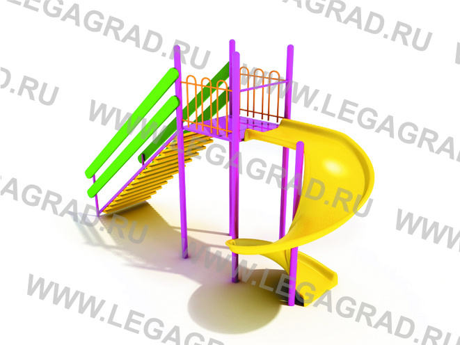 Детский игровой комплекс с предназначен для детей от 10-ти лет . Комплектация: горка винтовая Н=2,25 м -1 шт, площадка - 1 шт, лестница - 1шт. Несущие столбы комплекса выполнены из металлической трубы сечением 58 мм. Столбы бетонируются в землю. Пол на площадке изготовлен из влагостойкой ламинированной нескользящей фанеры толщиной 15 мм и металлического каркаса из трубы сечением 40х20мм. Горка винтовая выполнена из стеклопластика H=2,2 м. Горка имеет стартовую площадку с перекладиной сечением Ø 26 мм, заставляющую ребенка присесть, полосу разгона и участок торможения. Металлический каркас лестницы изготовлен из трубы сечением 40х20мм, уголка 40 и имеет металлические поручни для рук сечением Ø 26 мм, ступеньки лестницы изготовлены из доски камерной сушки толщиной 35 мм. Ограждение площадки металлическая труба сечением Ø 21, 26 мм. Деревянные детали тщательно отшлифованы, загрунтованы и окрашены. Металлические детали окрашены порошковыми красками. Поставляется в разобранном виде. Соединение деталей на болты оцинкованные.