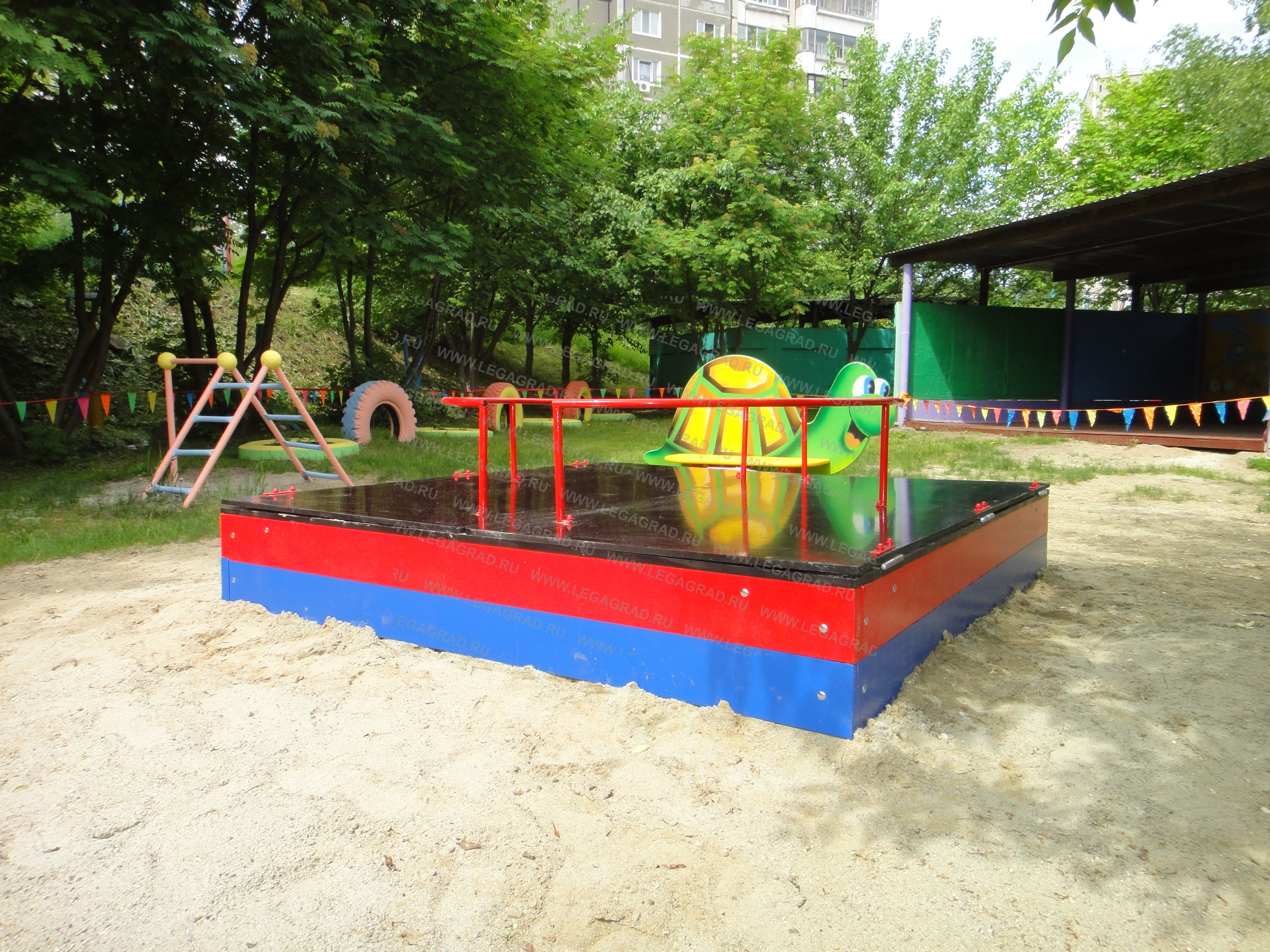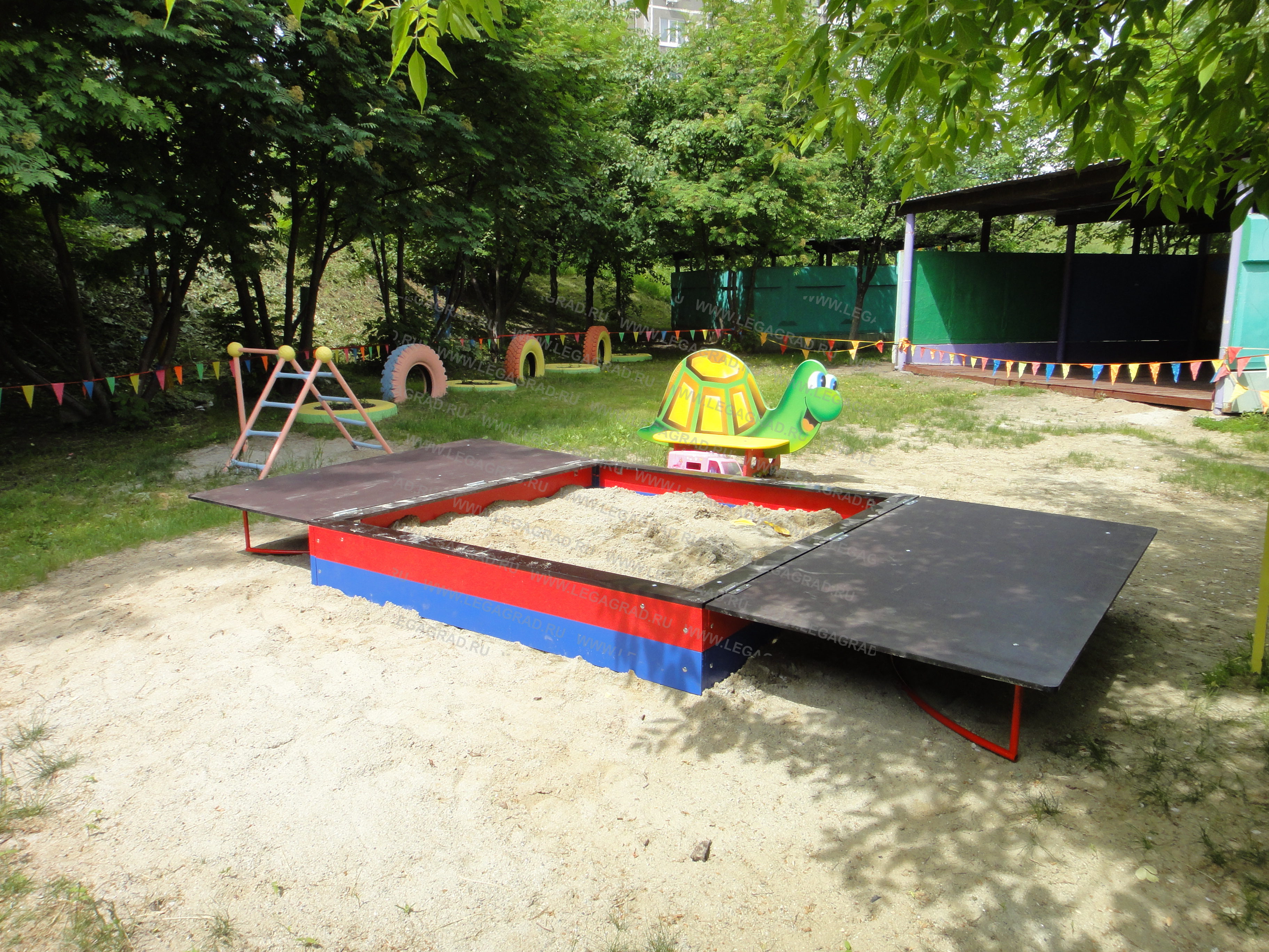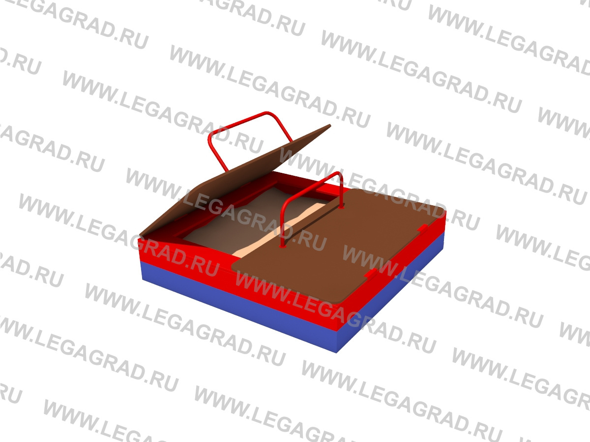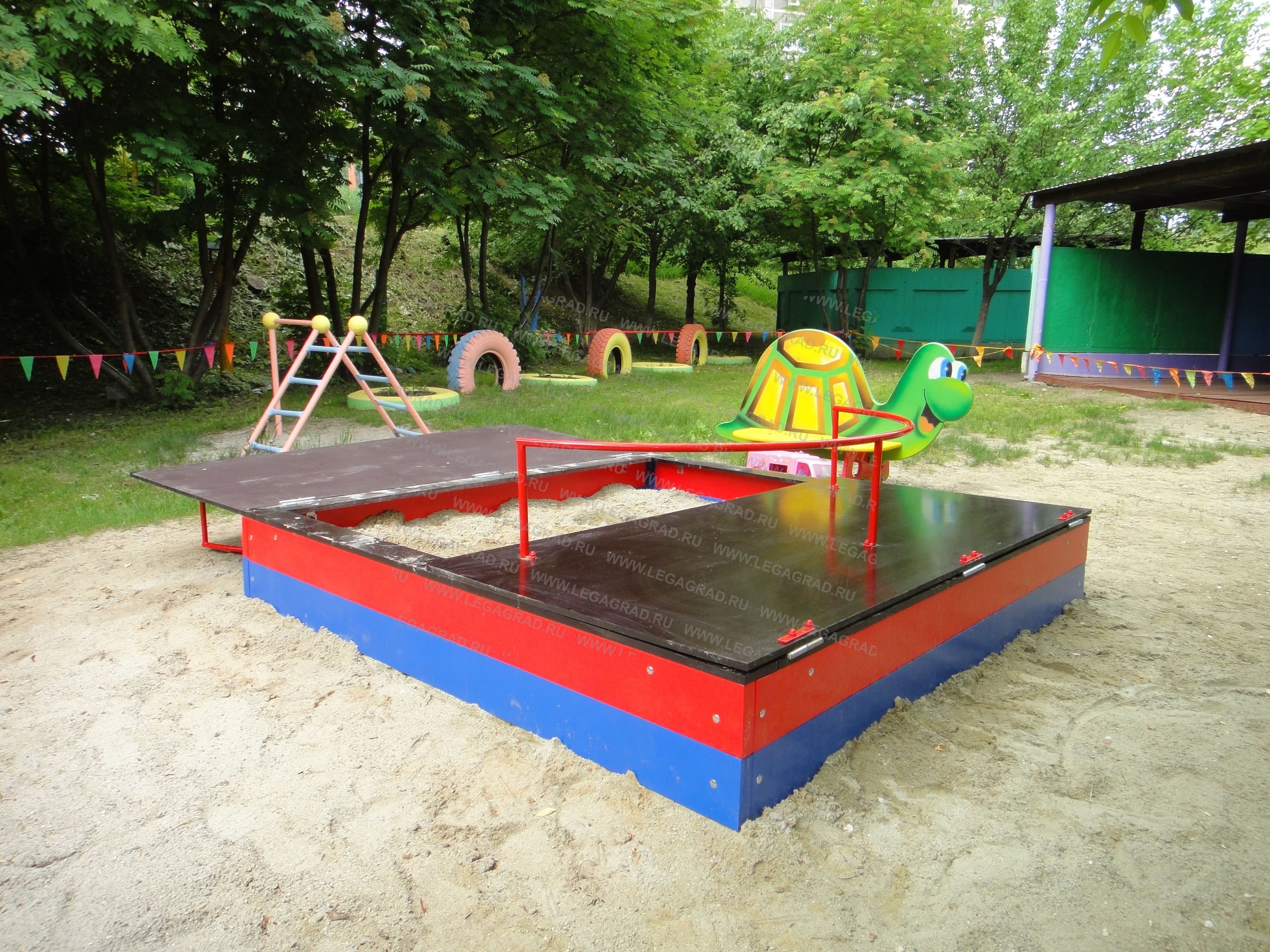 Песочница предназначена для детей от 1-го года. Песочница высотой 0,3м выполнена из доски камерной сушки толщиной 35 мм в количестве: 8 шт. (боковые), соединенных по углам металлическими уголками. Наличник 4 шт. Крышка песочницы откидная состоит из двух частей прямоугольной формы изготовлена из ламинированной влагостойкой фанеры толщиной 15 мм крепится к каркасу песочницы на петли-навесы, на крышках установлены ручки изготовленные из металлической трубы сечением Ø 21мм по 1 шт. В открытом положении крышки встают в один уровень с песочницей. Деревянные детали тщательно отшлифованы, загрунтованы и окрашены. Металлические детали окрашены порошковыми красками.