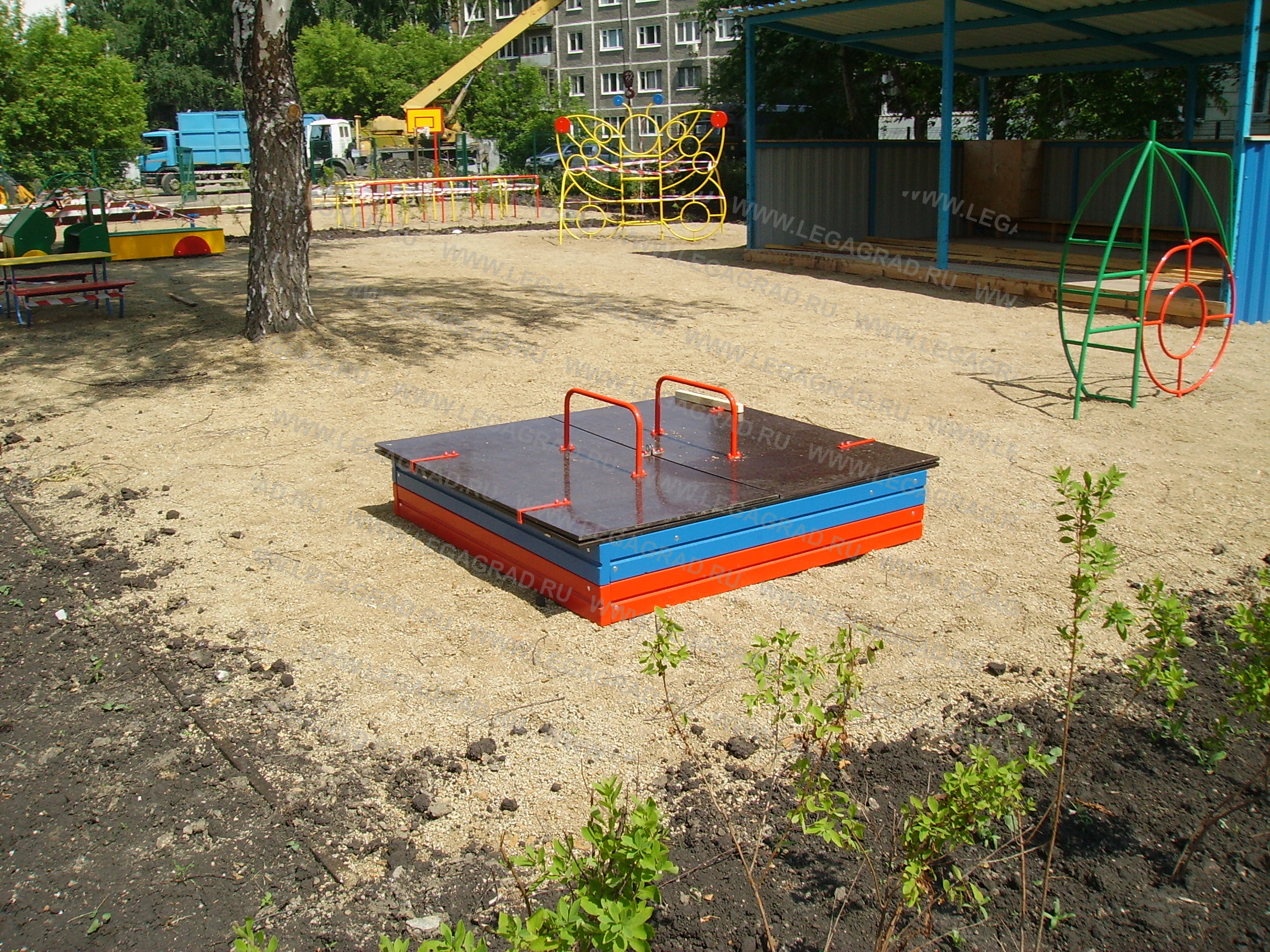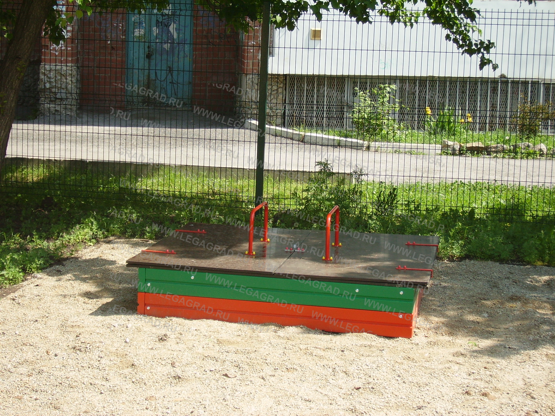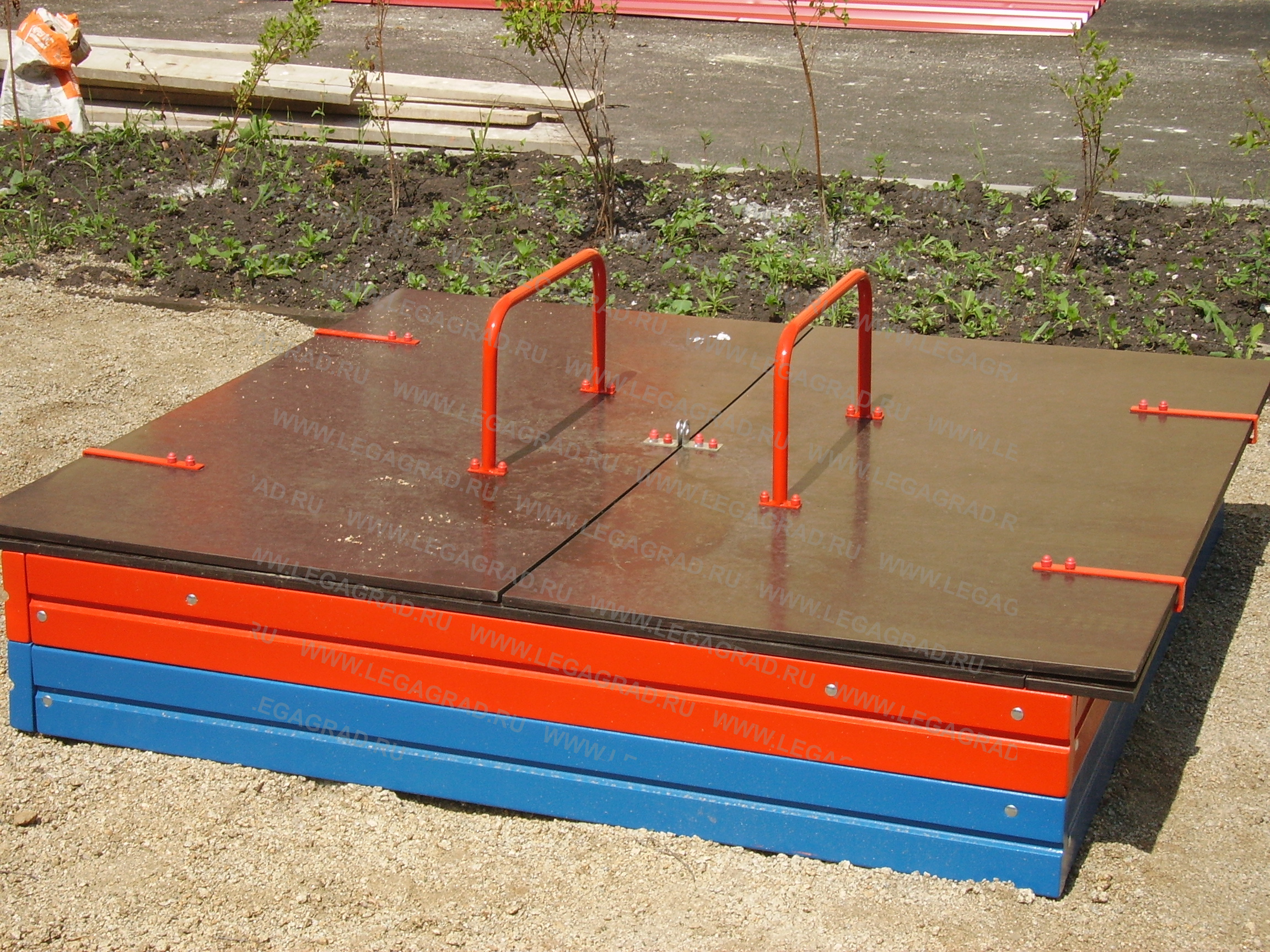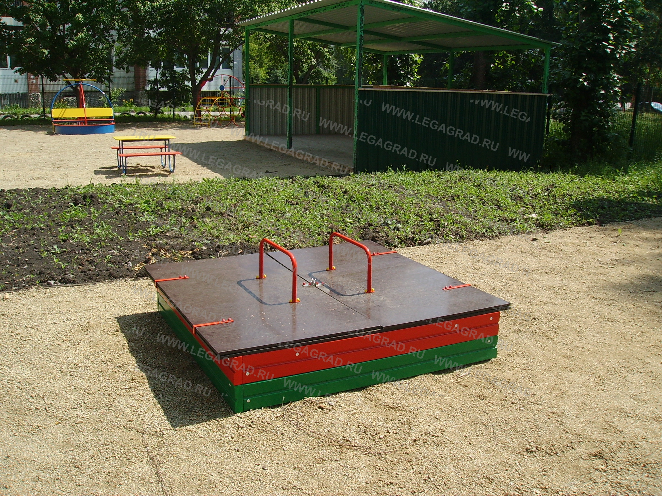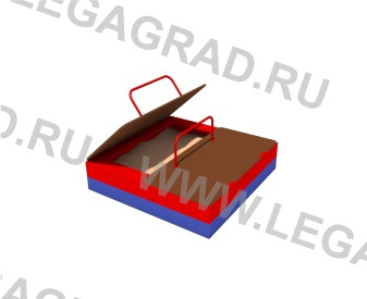 Песочница предназначена для детей от 1-го года. Песочница высотой 0,3м выполнена из доски камерной сушки толщиной 35 мм в количестве: 8 шт. (боковые), соединенных по углам металлическими уголками. Наличник 4 шт. из доски 20мм. Крышка песочницы откидная состоит из двух частей прямоугольной формы изготовлена из ламинированной влагостойкой фанеры толщиной 15 мм крепится к каркасу песочницы на петли-навесы, на крышках установлены ручки изготовленные из металлической трубы сечением Ø 21мм по 1 шт. В открытом положении крышки встают в один уровень с песочницей. Деревянные детали тщательно отшлифованы, загрунтованы и окрашены. Металлические детали окрашены порошковыми красками.