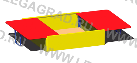 Песочница предназначена для детей от 1-го года. Короб песочницы высотой 0,3м выполнен из влагостойкой фанеры (ФСФ) толщиной 18 мм, состоит из 4-х боковых деталей. Створки в количестве 2-х шт. выполнены из фанеры ламинированной (ЛФСФ) толщиной 15 мм. По углам песочницы установлены металлические уголки длиной 0,4м. Створки песочницы раздвижные. На створках установлены ручки по 1 шт. Соединение деталей болтовое. Болты оцинкованные. Деревянные детали тщательно отшлифованы, загрунтованы и окрашены. Металлические детали окрашены порошковыми красками.